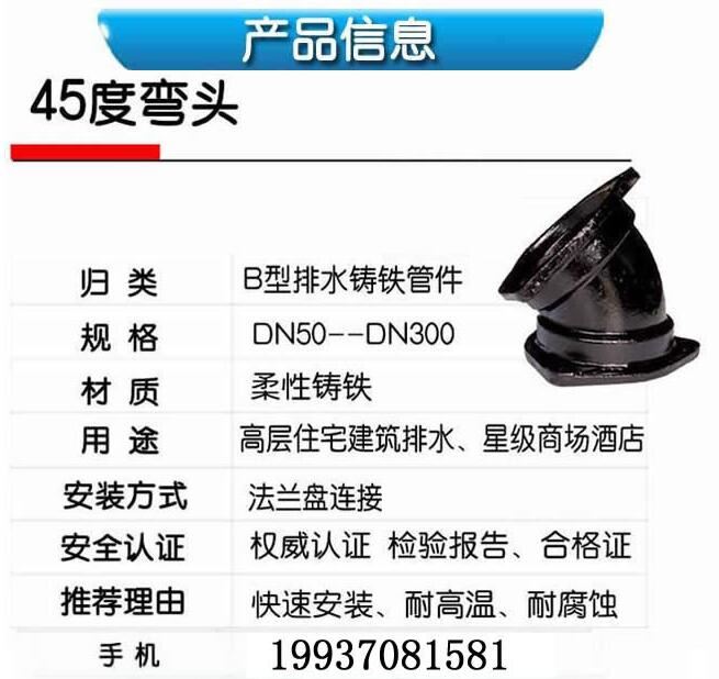 B型45度彎頭 直角彎頭 B型離心機(jī)制法蘭連接柔性排水鑄鐵管件彎頭