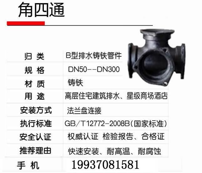 廠家直銷鑄鐵排水管件-B型鑄鐵管件直角四通 法蘭盤連接,快速安裝,耐高溫,耐腐蝕;用于高層住宅建筑排水、星際商場酒店。