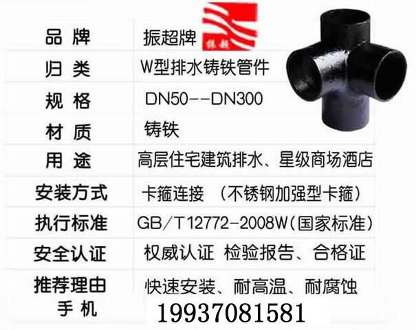 振超牌W型鑄鐵排水管件,柔性抗震鑄鐵,快速安裝,耐高溫,耐腐蝕;用于高層住宅建筑排水、星際商場(chǎng)酒店。