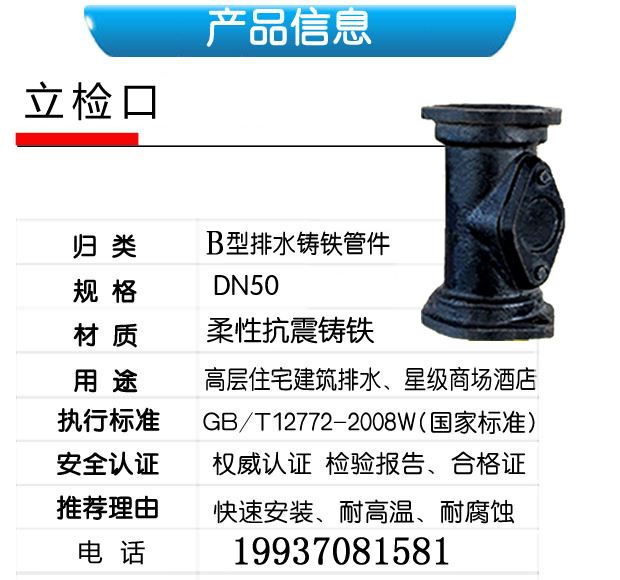 柔性鑄鐵排水管立檢口,柔性抗震鑄鐵,快速安裝,耐高溫,耐腐蝕;用于高層住宅建筑排水、星際商場酒店。
